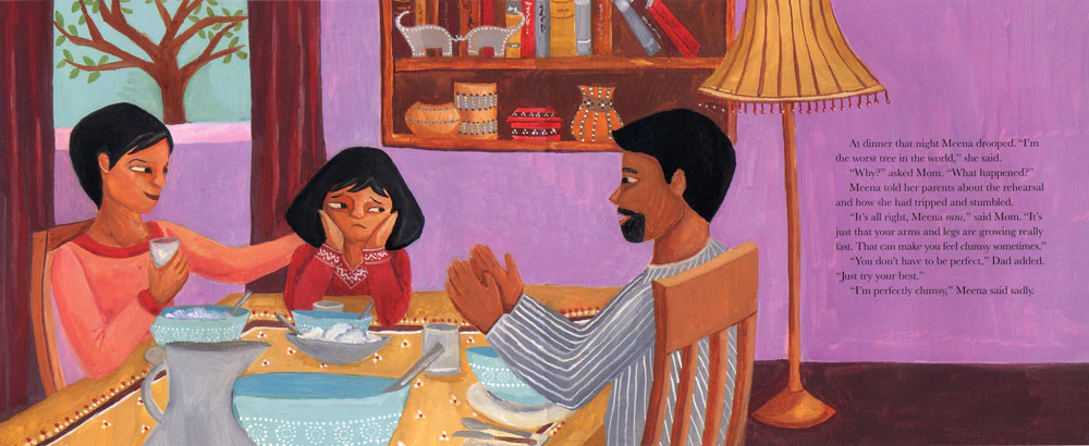 Embarrassed by her clumsiness, eight-year-old Meena, an Asian Indian American girl, is reluctant to appear in the school play until she gains self-confidence by practicing yoga.